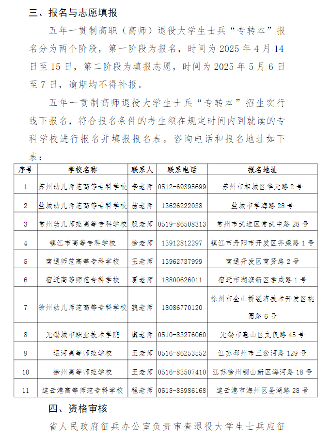 关于做好2025年江苏省五年一贯制高师退役大学生士兵“专转本”招生工作的通知