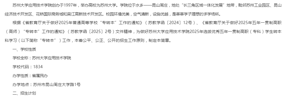 苏州大学应用技术学院2025年五年一贯制高职“专转本”招生简章